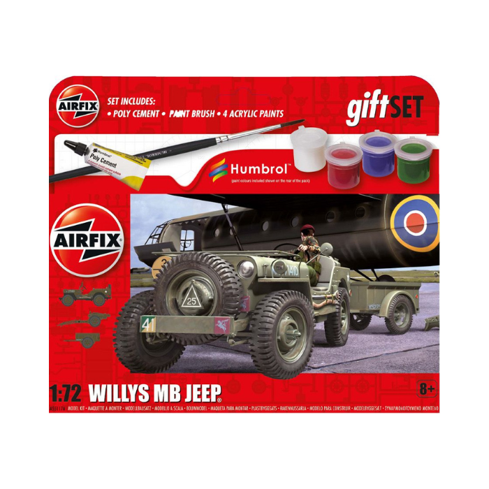 Capture the spirit of WWII with the Willys MB Jeep model kit. This detailed 1:72 scale replica measures 3 cm in length, 2.46 cm in height, and 23.3 cm in width, making it a fantastic addition to any model collection.