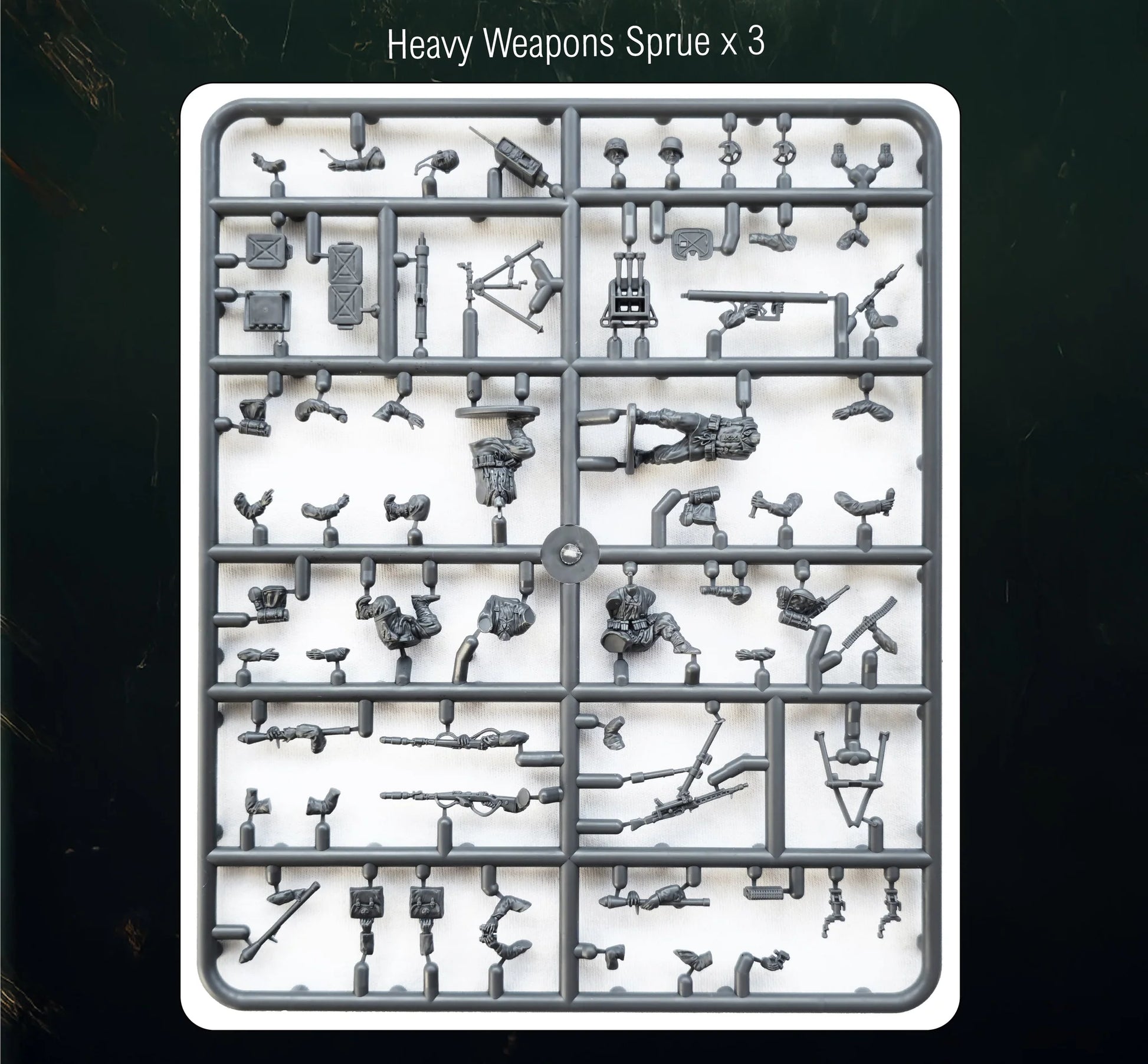 Using the same frames from the original set, this will contain 3 heavy weapons sprues, and 2 of the main infantry sprues, allowing you to build a huge number of heavy weapons support troops.