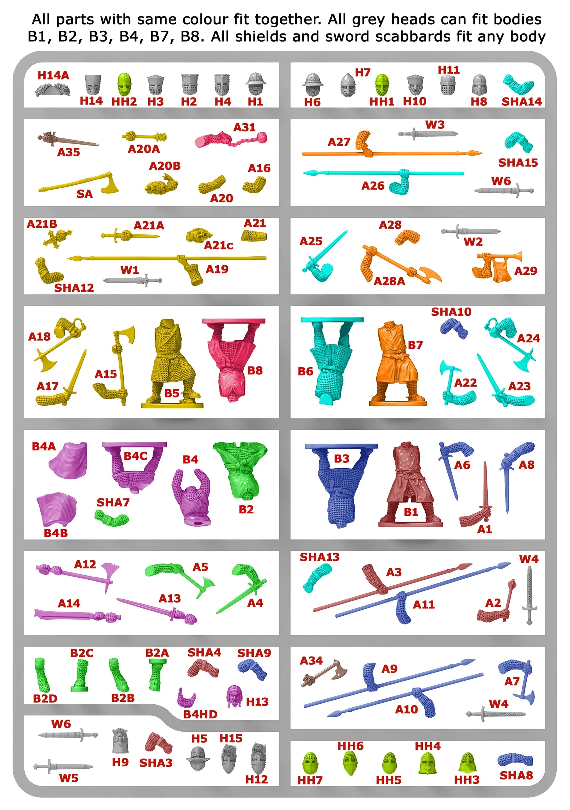 Earlier styles can be used together with later styles as equipment would last generations as it was passed from Father to Son. These can all be interchangeable with our mounted Knights set.