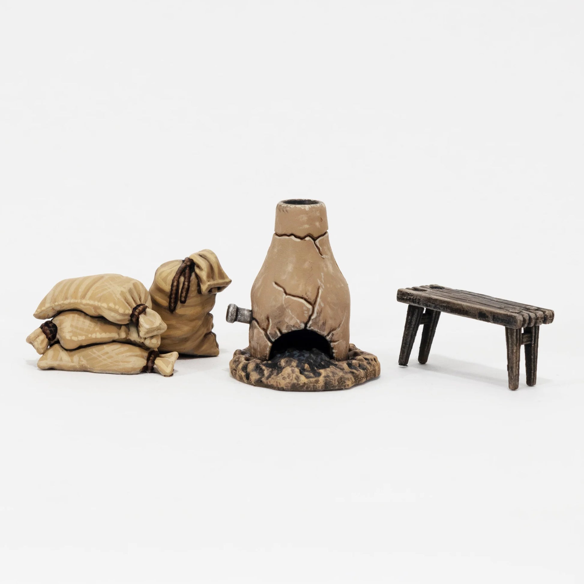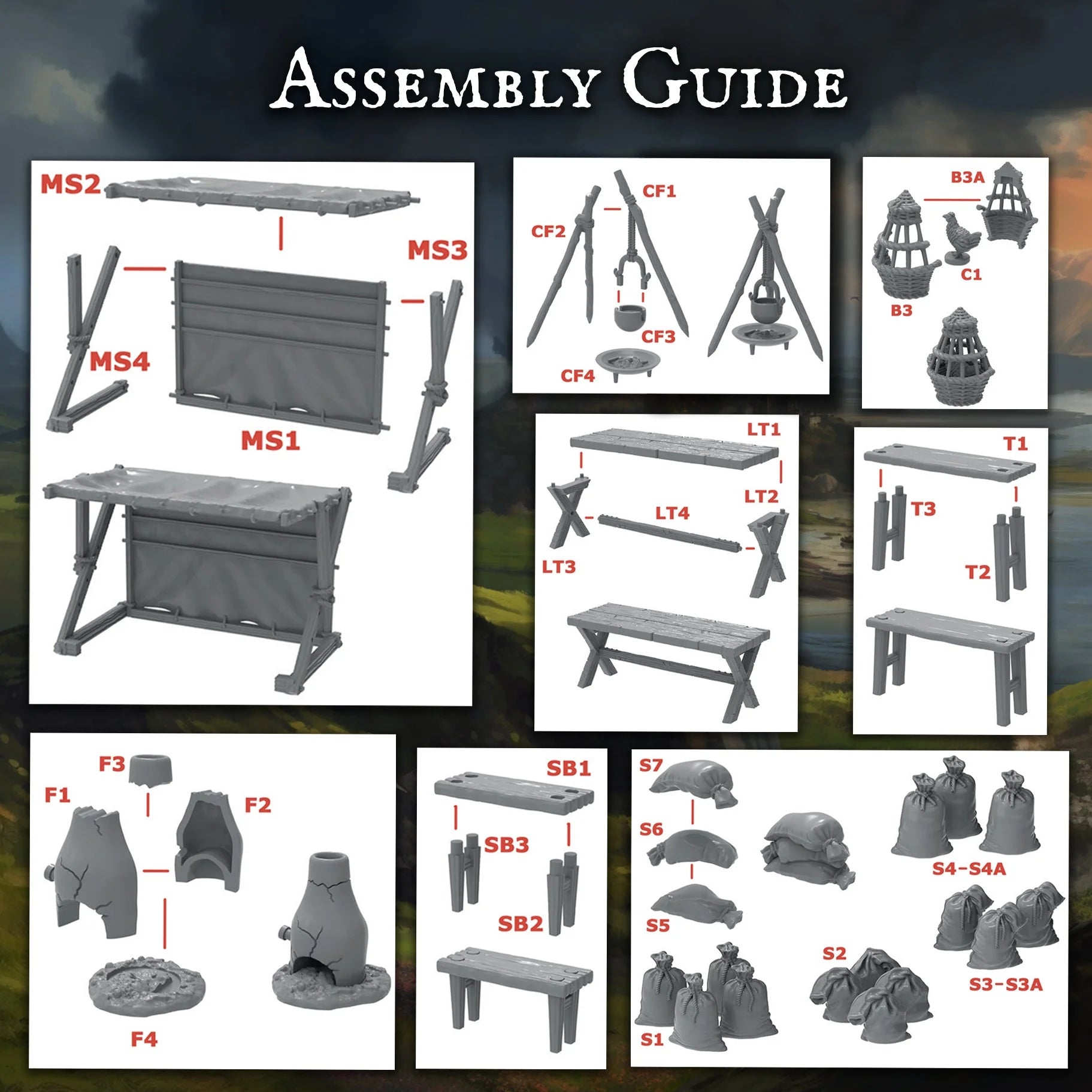From tables and stools to baskets of food, cooking pots, and serving dishes, this kit provides everything needed to create a lively marketplace or camp supply area. Ideal for use with Pillage or any historical or fantasy setting